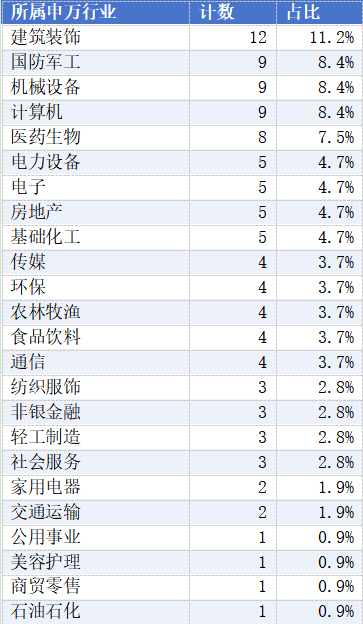 从行业角度来看,今年以来所有“戴星”的*ST公司中,建筑装饰行业最多有12家,国防军工、机械设备、计算机行业均有9家,医药生物行业有8家。