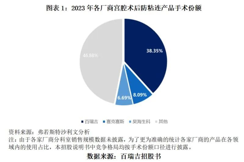 弗若斯特沙利文的资料还显示,若以手术份额为统计口径,2023年,百瑞吉在我国宫腔、鼻(窦)腔术后防粘连产品手术份额分别为38.35%、31.83%,与赛克赛斯、昊海生科同属于细分行业主力供应厂商。