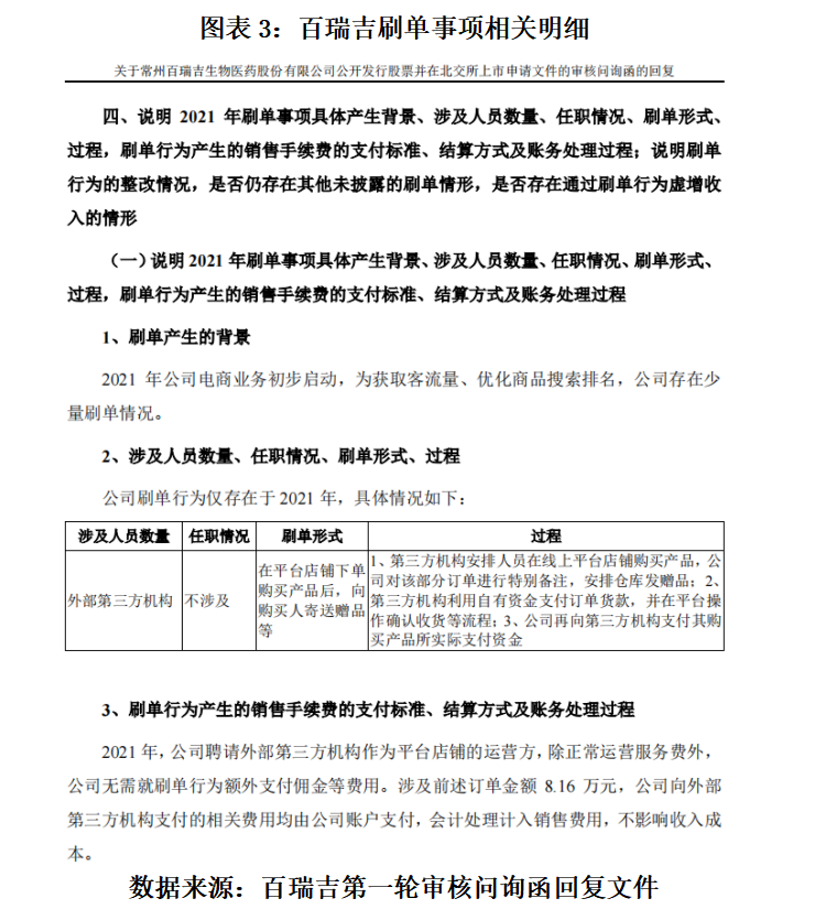 第一轮审核问询函回复文件则显示,2021年百瑞吉电商业务启动初期,为了获取客流量、优化商品搜索排名,该公司在所聘请的外部第三方运营机构的协助下,存在少量刷单的情形,涉及的刷单订单金额为8.16万元。