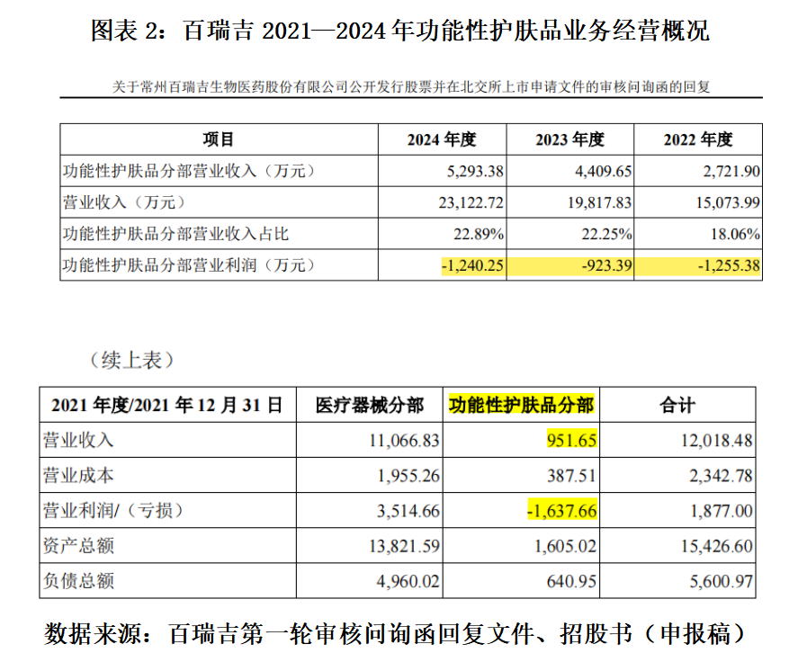 招股书及第一轮审核问询函回复文件显示,2021—2024年,百瑞吉功能性护肤品的营业利润分别为-1637.66万元、-1255.38万元、-923.39万元、-1240.25万元,合计为-5056.68万元。