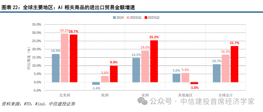 综合万得数据和世界贸易组织(WTO)统计报告,以我国和美国为代表的AI算力产业建设持续推进,AI相关贸易金额持续较快速增长,对全球经济和贸易的积极拉动作用正在持续显现。WTO在10月7日的最新报告《全球贸易展望与统计》中认为,受AI相关贸易等多因素拉动,2025年上半年全球商品贸易数据好于预期。其中,亚洲和北美地区,是AI相关贸易增长最快的区域。