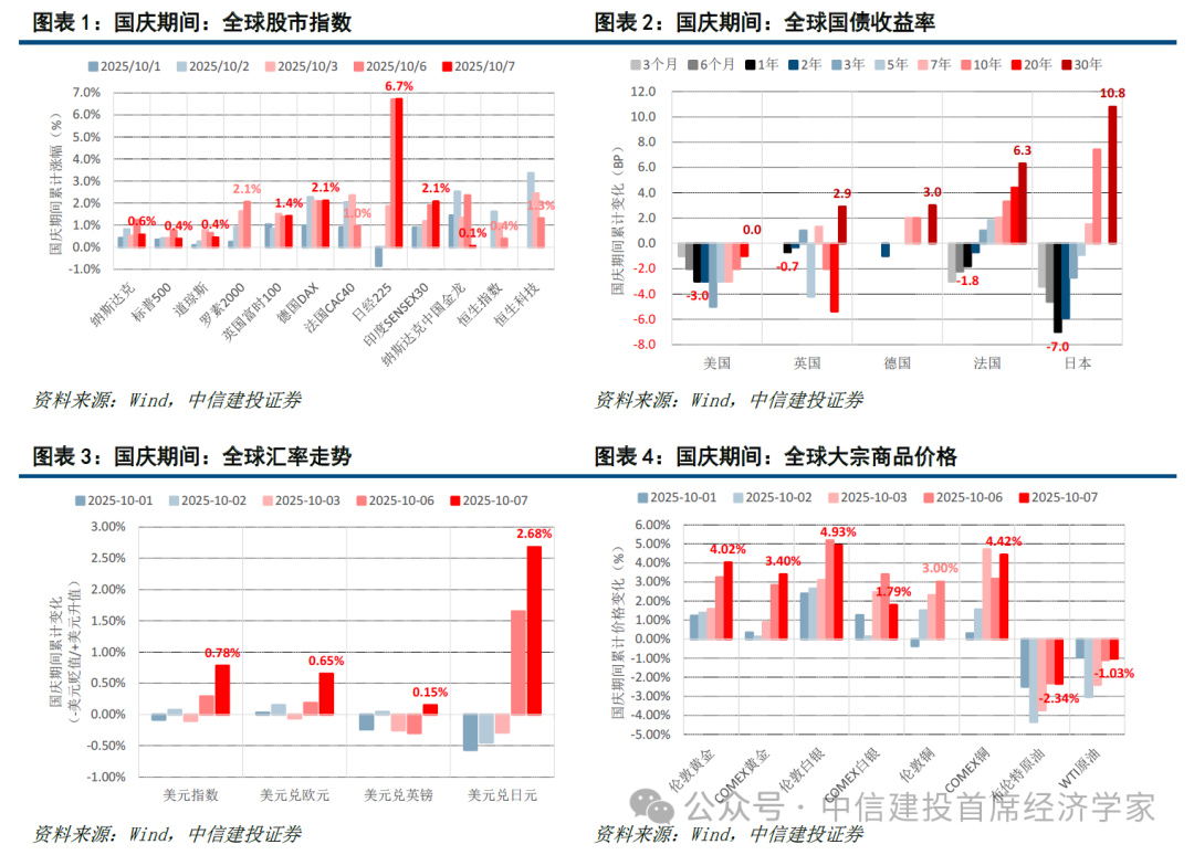 我国国庆期间,全球主要市场和资产价格走势,较9月30日的累计变化,参见图表1-图表4: