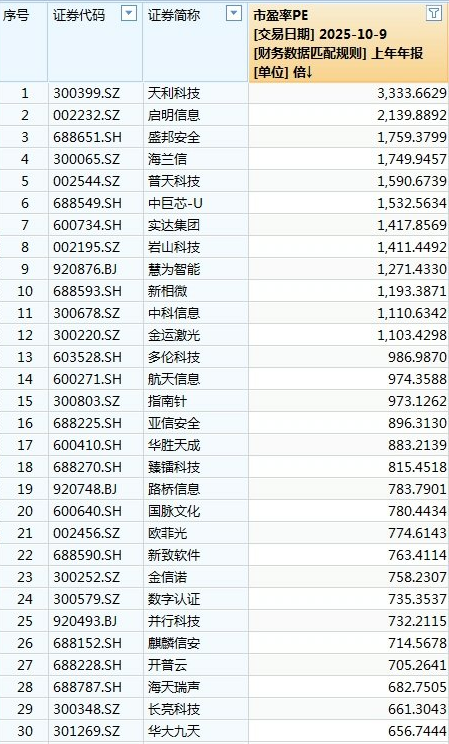 排名第一的天利科技(300399.SZ),其静态市盈率达到夸张的3333.66倍。