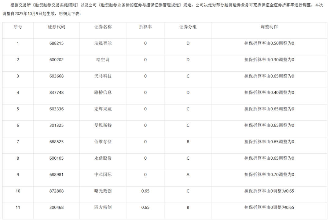 类似动作并非个例。国泰海通证券在10月9日发布公告,亦将中芯国际、佰维存储的两融折算率从70%和65%下调至0,理由之一为“根据交易所要求”。