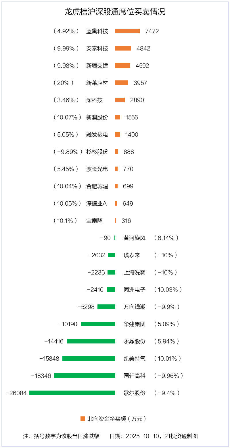 10月10日,北向资金参与龙虎榜中的个股共有22只,合计净卖出6.69亿元。其中沪股通净买入3 股,净卖出5 股,合计净卖出2.62亿元;深股通净买入9 股,净卖出5 股,合计净卖出4.07亿元。