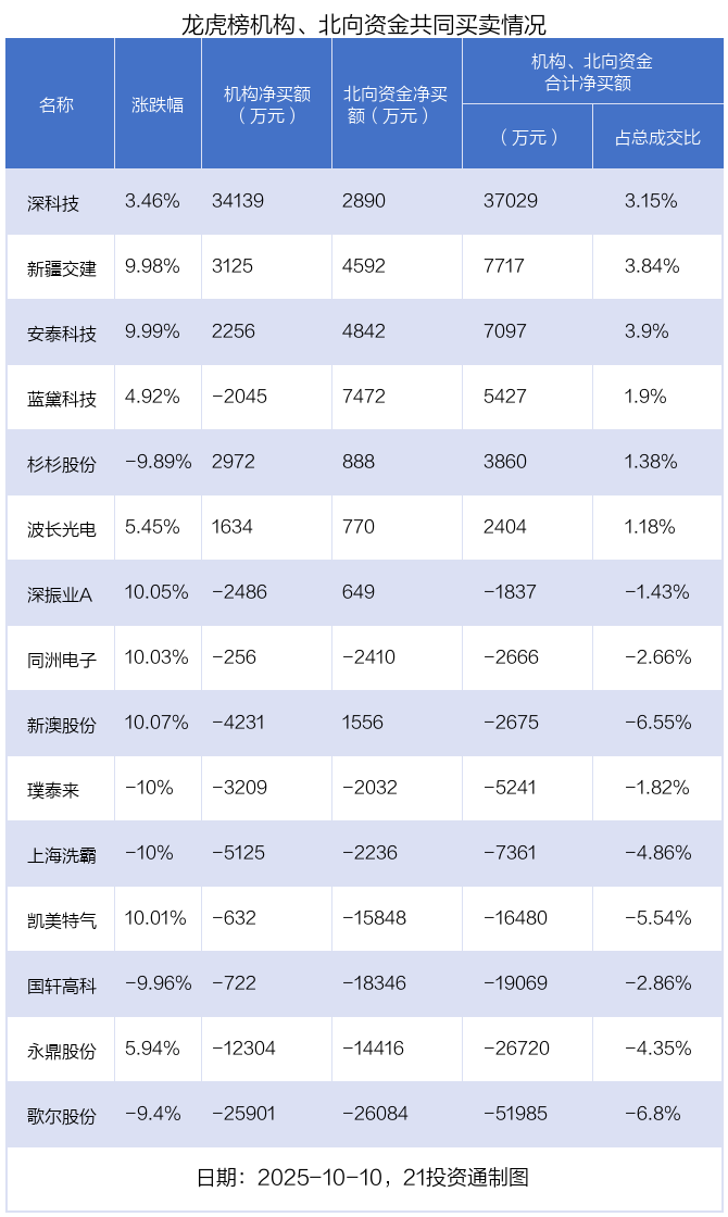 值得注意的是,机构和北向资金共同净买入了安泰科技、新疆交建、深科技、杉杉股份、波长光电等5股;共同净卖出了璞泰来、上海洗霸、同洲电子、永鼎股份、凯美特气、国轩高科、歌尔股份等7股;在蓝黛科技,新澳股份,深振业A上出现分歧,机构净卖出蓝黛科技2045.04万元,北向资金净买入7471.91万元;机构净卖出新澳股份4230.84万元,北向资金净买入1556.18万元;机构净卖出深振业A2485.51万元,北向资金净买入648.98万元。