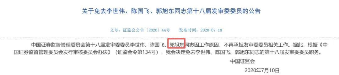2019年9月,郭旭东正式从证监会离职。不过直到2020年7月,证监会才正式发布公告,免去其第十八届发审委委员职务。