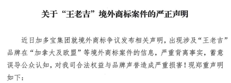 加多宝表示,在加拿大与欧盟,加多宝旗下的万捷有限公司均被当地法院判定合法持有“王老吉”商标权。目前,万捷在全球超过60个国家和地区拥有“王老吉”商标权(包括王老吉、WONG LO KAT、WANG LAO JI及其他图文组合商标)。