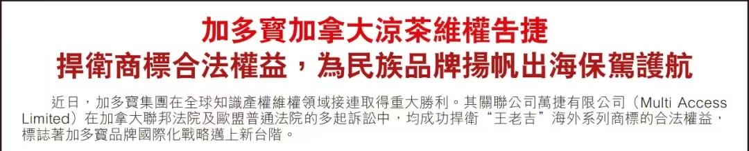 9月30日上午,加多宝官方微信公众号发表《加多宝加拿大凉茶维权告捷》一文,称其关联公司万捷有限公司(Multi Access Limited)在加拿大联邦法院及欧盟普通法院的多起诉讼中,均成功捍卫“王老吉”海外系列商标的合法权益,标志着加多宝品牌国际化战略迈上新台阶。