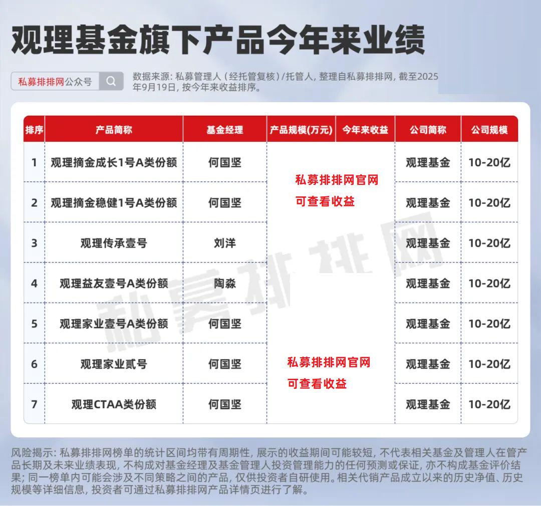 私募排排网数据显示,截至9月19日,观理基金旗下有业绩显示的7只产品,今年来收益均值约为***%,其中“观理摘金成长1号A类份额”今年来收益高达***%,表现较为突出。