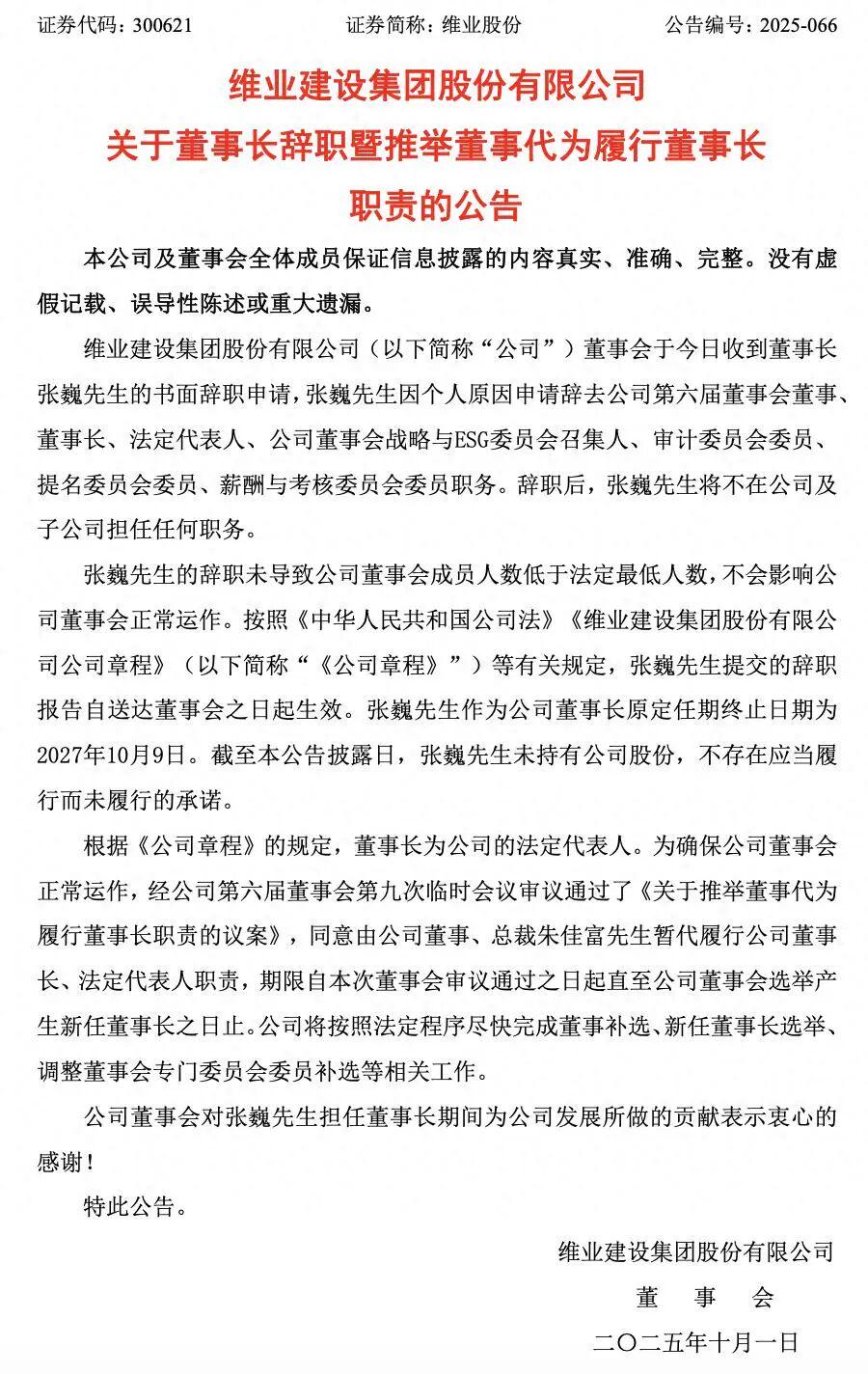 9月30日,建筑装饰行业的上市公司维业股份(300621)骤然发布公告,董事长张巍因个人缘由辞去公司所有职务,这一消息迅速引发了市场的广泛关注。