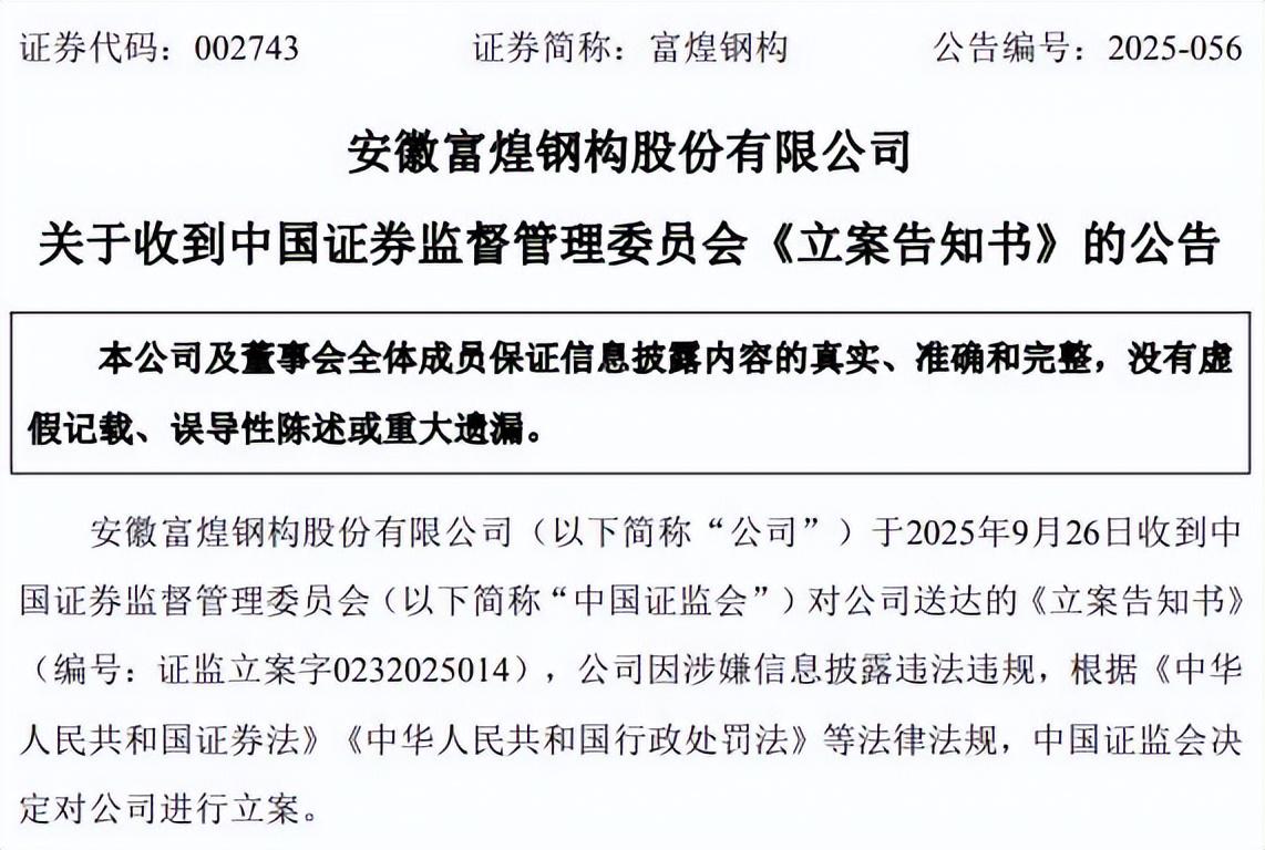 2025年9月27日,富煌钢构发布公告称,因涉嫌信息披露违法违规,收到中国证监会《立案告知书》。