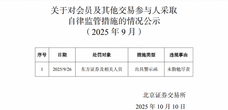 10月10日,北交所官网公布了2025年9月对会员及其他交易参与人采取自律监管措施的情况公示。根据公告,东方证券及相关人员被北交所采取出具警示函的措施,原因为未勤勉尽责。