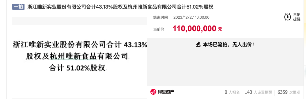 早在2023年,浙江唯新实业合计43.13%股权,及杭州唯新食品有限公司合计51.02%股权也曾被司法拍卖,起拍价1.1亿,最后以流拍告终。据都市快报橙柿互动报道,上述股权的所有人曾牵扯进“温商贷”非吸案。
