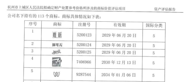 拍卖公告显示,这113个商标包括“唯新”“酥可儿”等,报告显示其评估价值为1420万元,拍卖时处于被法院查封状态。