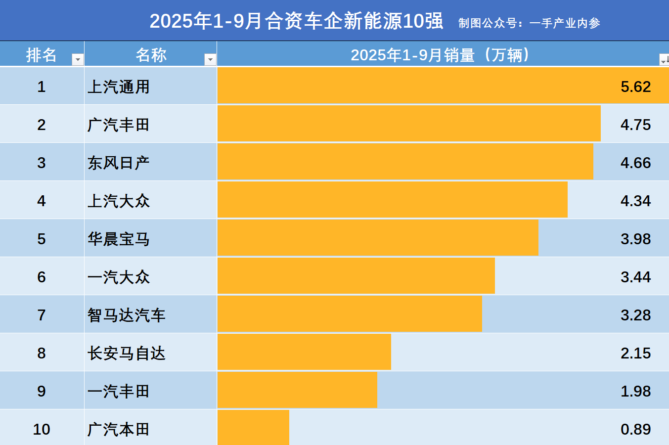 另附:2025年1-9月合资车企新能源汽车销量10强,数据源于:中汽数研。