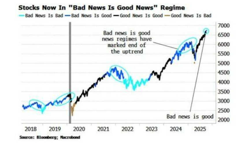 更值得警惕的是,据彭博分析师Simon White观察,市场已进入“坏消息就是好消息”的危险模式。在此阶段,疲软的经济数据反而会刺激股市上涨,因为投资者押注美联储将因此放松货币政策。这一反常现象,在过去几次主要市场顶部出现前都曾上演。