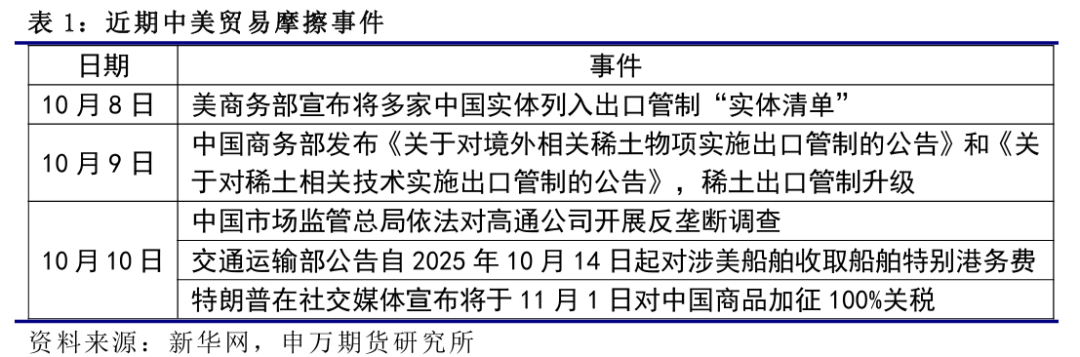 近期中美贸易摩擦升再度升级。10月8日,美商务部宣布将多家中国实体列入出口管制“实体清单”。10月9日中国商务部发布《关于对境外相关稀土物项实施出口管制的公告》和《关于对稀土相关技术实施出口管制的公告》,稀土出口管制升级。10月10日,因高通公司收购Autotalks公司未依法申报经营者集中,涉嫌违反《中华人民共和国反垄断法》,市场监管总局依法对高通公司开展立案调查。10月10日,交通运输部公告,自2025年10月14日起对涉美船舶收取船舶特别港务费。