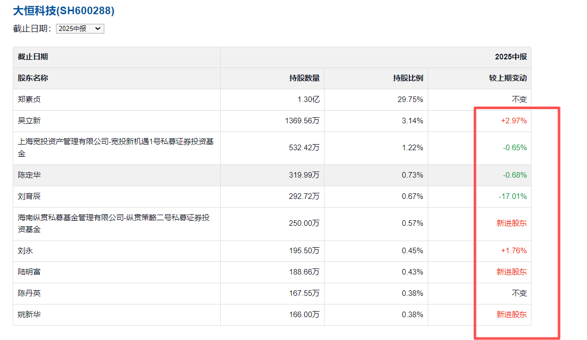 或让资本市场存在想象力的是,随着郑素贞的彻底退出,大恒科技的股东结构正在经历一场大换血。2025年中报显示,大恒科技十大流通股东发生了显著变化:3位股东新进,3位股东退出,2位股东增持,3位股东的持股减少。