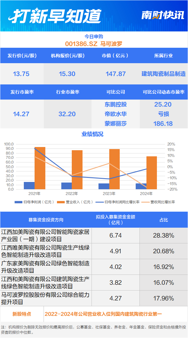 10月13日,可申购深市主板上市的马可波罗(001386.SZ),该公司专注于建筑陶瓷的研发、生产和销售,是国内最大的建筑陶瓷制造商和销售商之一。