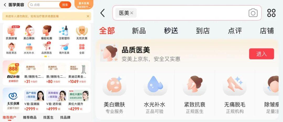 ▲ 美团和京东都开始布局医美。图 / 美团App(左)京东App(右)