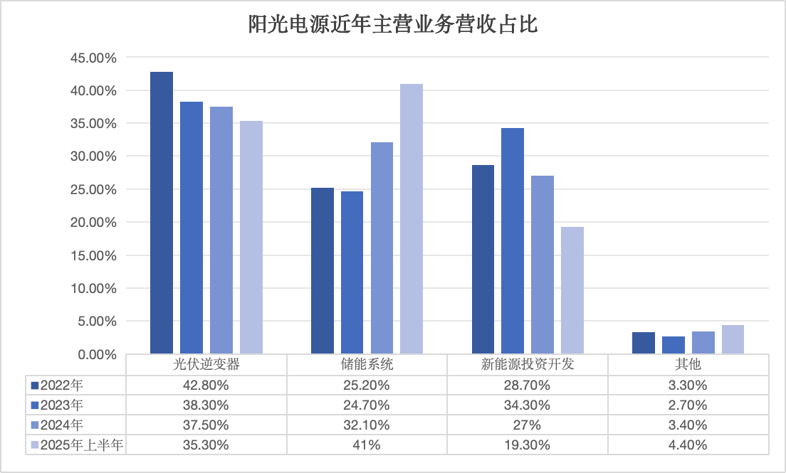 阳光电源成立于1997年,公司从光伏逆变器业务起步,逐步扩展至所谓的“光风储电氢”——太阳能、风能、储能、电动汽车及充电、氢能五大赛道。今年上半年,公司储能系统营收首次超越“老本行”逆变器。