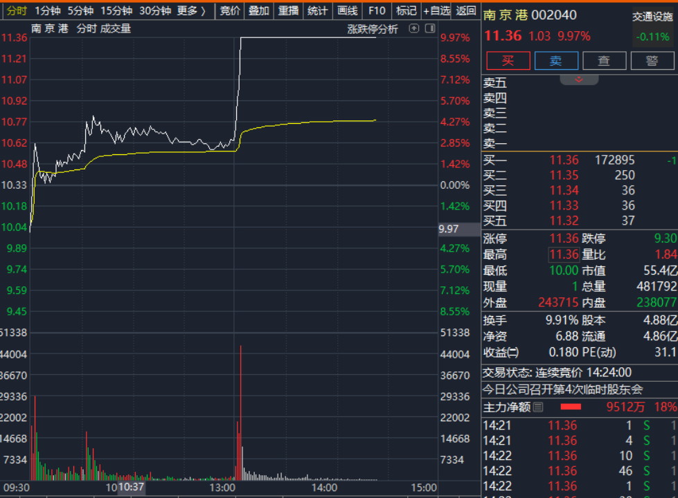 10月13日午后,南京港股价直线拉升,3分钟内就被资金封死涨停板;连云港也大幅拉升,涨幅一度接近8%,北部湾港、重庆港也纷纷跟涨;部分航运股也有拉升动作,国航远洋、宁波海运一度涨超6%,凤凰航运、华光源海等跟涨。