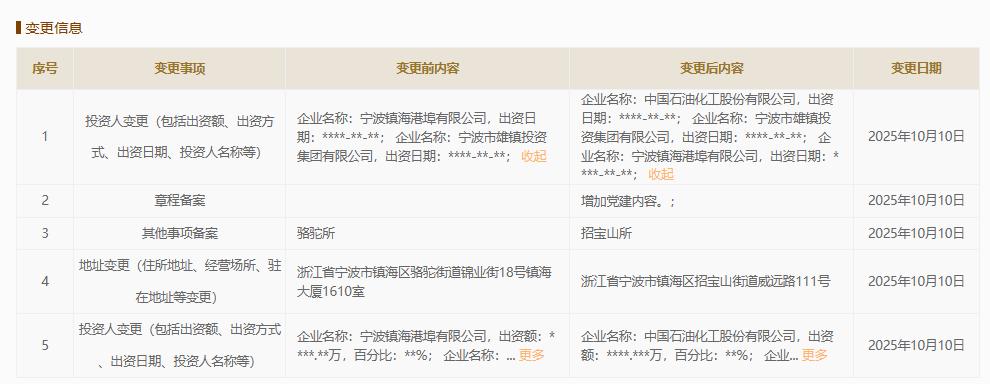 【中石化入股宁波市星海码头公司】国家企业信用信息公示系统网站显示,2025年10月10日,宁波市星海码头有限公司发生工商变更,新增中国石油化工股份有限公司为股东,同时多位高管发生变更。天眼查App显示,该公司成立于2022年8月,法定代表人为周芒,经营范围为港口经营、船舶港口服务、非居住房地产租赁,现由宁波镇海港埠有限公司、宁波市雄镇投资集团有限公司及上述新增股东共同持股。(中新经纬APP)