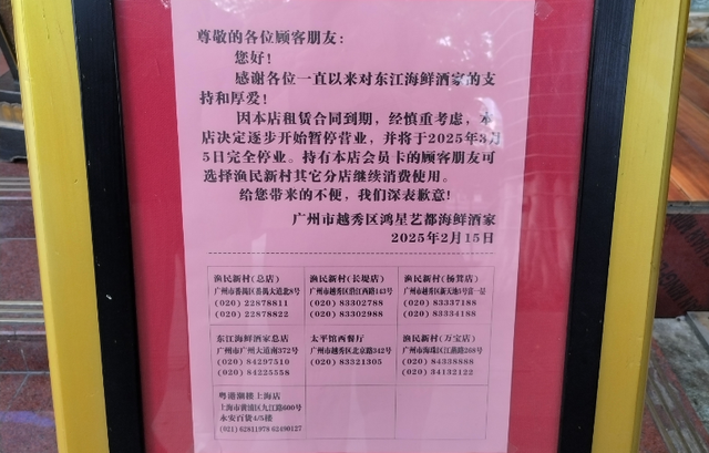 比如今年2月份,广州市鸿星艺都海鲜酒家就贴出了告示,在一个月后关门停业。