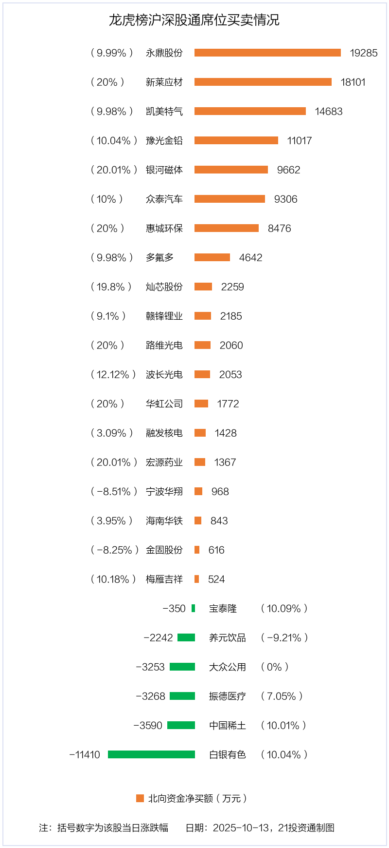 10月13日,北向资金参与龙虎榜中的个股共有25只,合计净买入8.71亿元。其中沪股通净买入7 股,净卖出5 股,合计净买入1.72亿元;深股通净买入12 股,净卖出1 股,合计净买入6.99亿元。