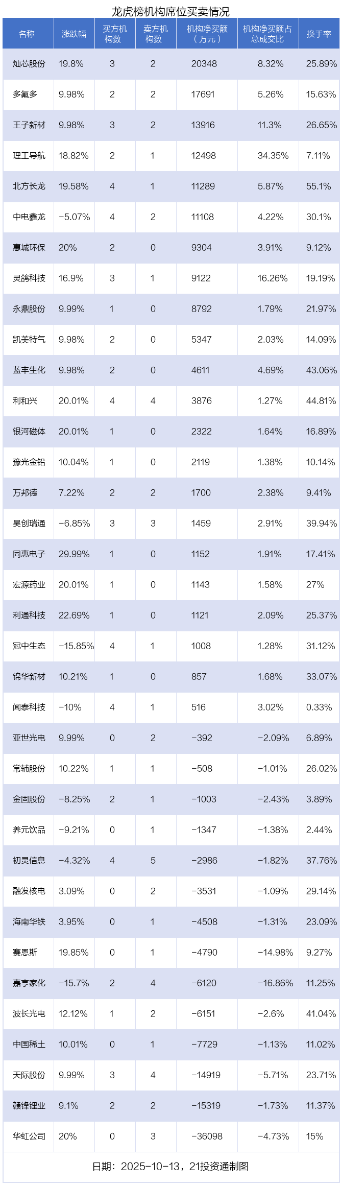 10月13日,36只个股龙虎榜出现了机构的身影,机构合计净买入3.59亿元。具体来看,机构净买入22股,净卖出14股。