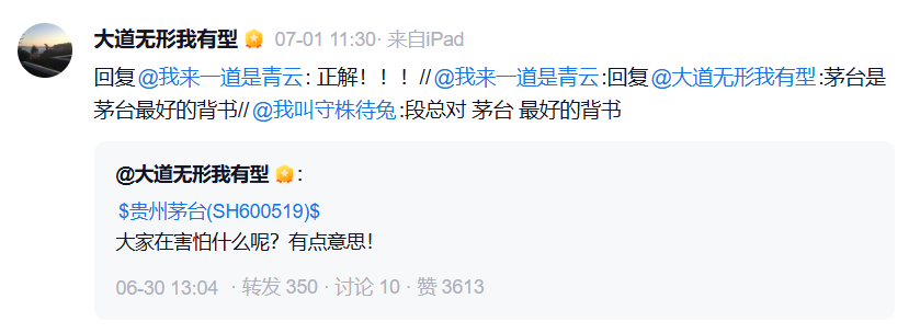 随后,有网友表示,“茅台是茅台最好的背书。”对此,段永平在雪球上回复“正解”二字,以表认同。