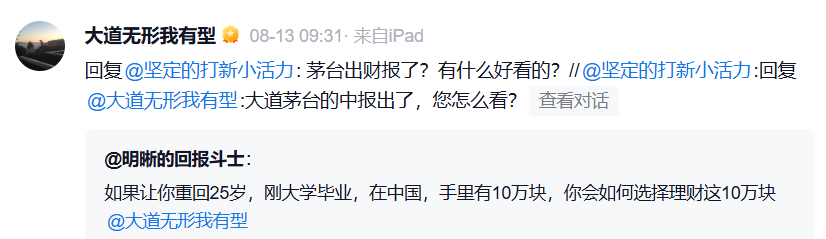 对于半年报,段永平8月13日在雪球上回应网友提问时表示,“茅台出财报了?有什么好看的?”
