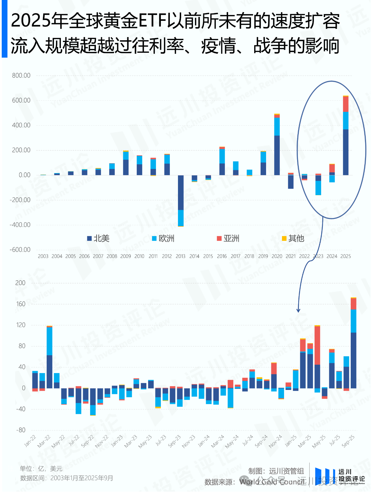 但今年以来,相比过去三年的力度,全球央行增持黄金趋势不变,速度有所放缓。与此同时,全球黄金ETF却迎来持续的爆发,尤其是欧美地区的投资者出现显著的增配。