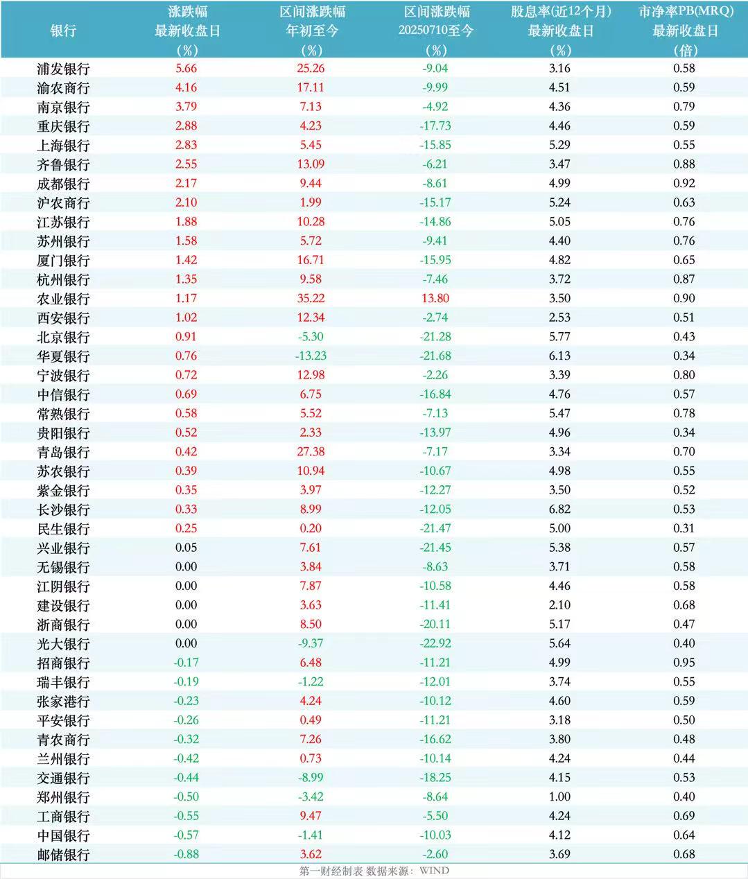 银行板块迎来久违上涨,在31个申万一级行业中位列第五位。其中,浦发银行涨5.66%,渝农商行涨4.16%,南京银行涨3.79%,重庆银行(601963.SH)、上海银行(601229.SH)、齐鲁银行(601665.SH)、成都银行(601838.SH)、沪农商行(601825.SH)涨幅也在2%以上。