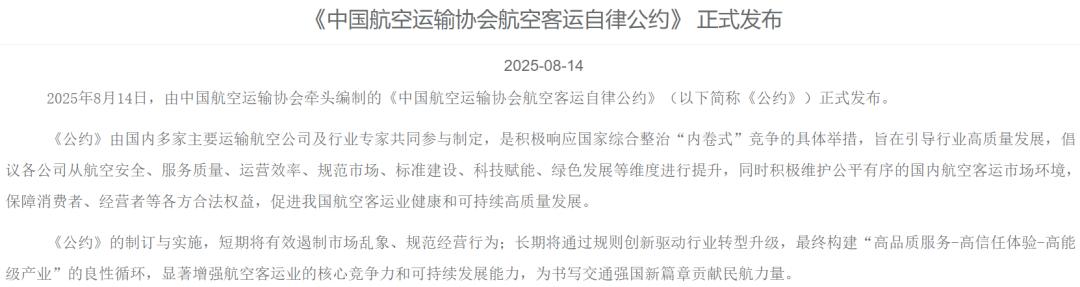 8月14日,中国航空运输协会牵头编制的《中国航空运输协会航空客运自律公约》正式发布,倡导各企业严格遵守价格法、反不正当竞争法等,杜绝低于成本价倾销、虚假宣传等恶意竞争行为。