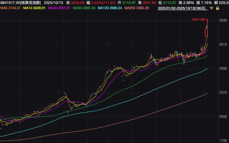 截至2025年10月13日,可控核聚变概念股龙头合锻智能实现4连板,报收26.16元/股。Wind数据显示,核聚变指数(8841917.WI)逆势上涨3.44%,从10月9号至今,41家成分股中39家涨幅为正,年初至今已有11家企业股价实现翻倍,指数累计涨幅为66.14%。