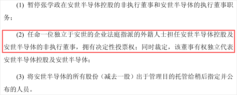 任命一名独立于安世的企业法庭指派的外籍人士担任安世半导体的非执行董事,拥有决定性投票权,且有权独立代表安世。