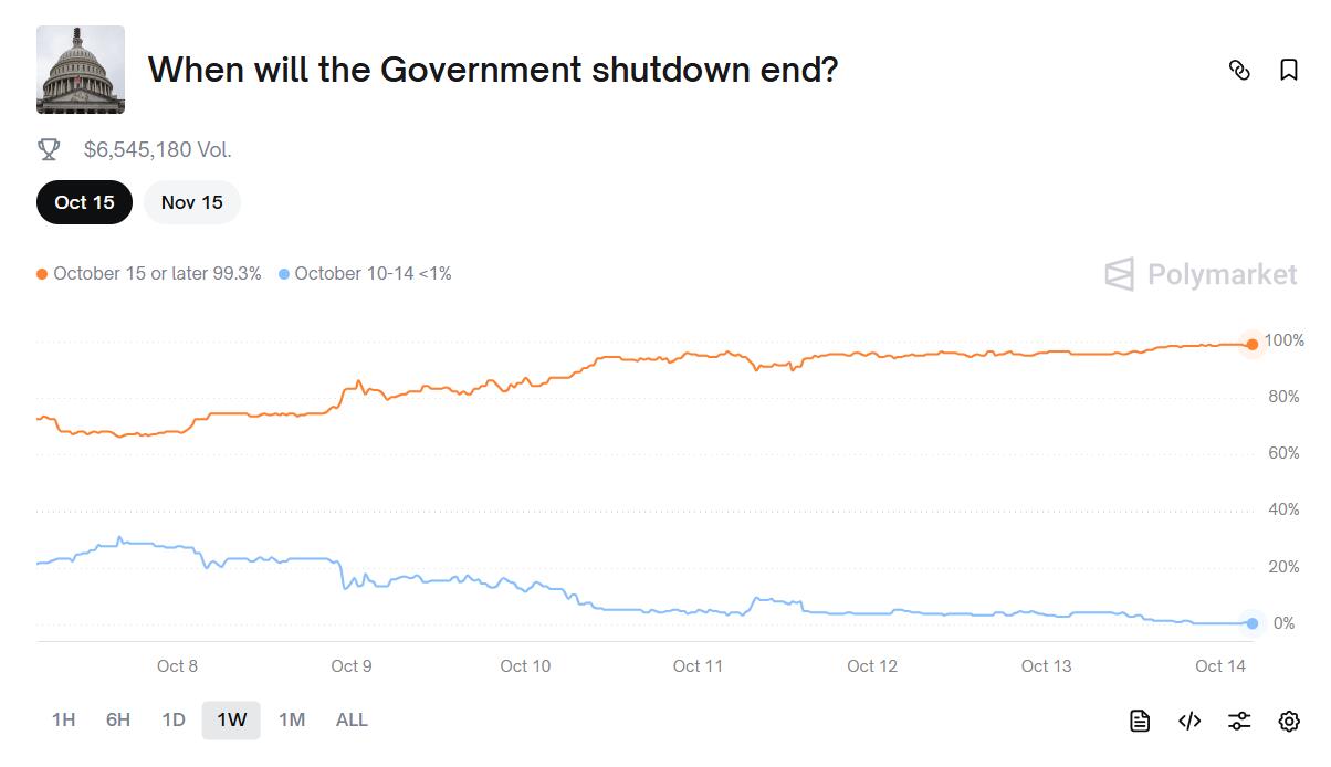 华尔街见闻查看,本周一,预测平台Polymarket的数据显示,政府关门截止于10月15日或之后的概率已超过99%,最迟10月14日结束关门的概率不足1%。