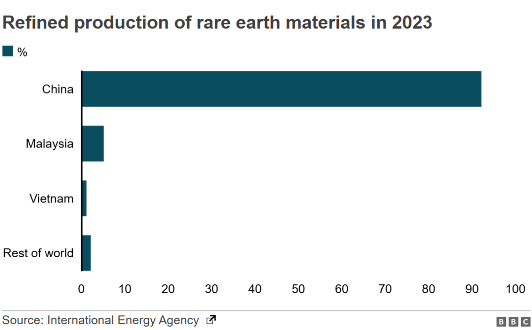 而中国,恰好又在稀土领域占据绝对优势。2024年中国稀土储量达4400万吨,占全球近49%的储量。当年产量27万吨,占全球的69.2%。