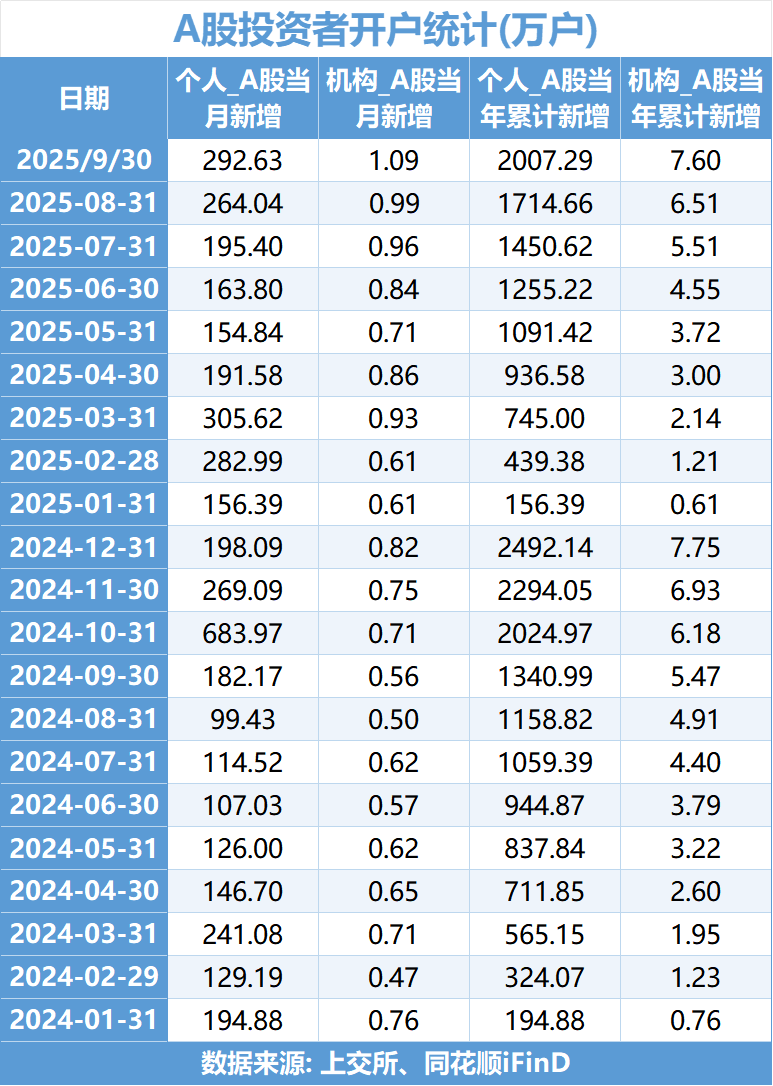 具体来看,9月A股293.72万户中,个人新开户292.63万户,机构新开户1.09万户,这属于今年以来机构新开户首次突破1万户。