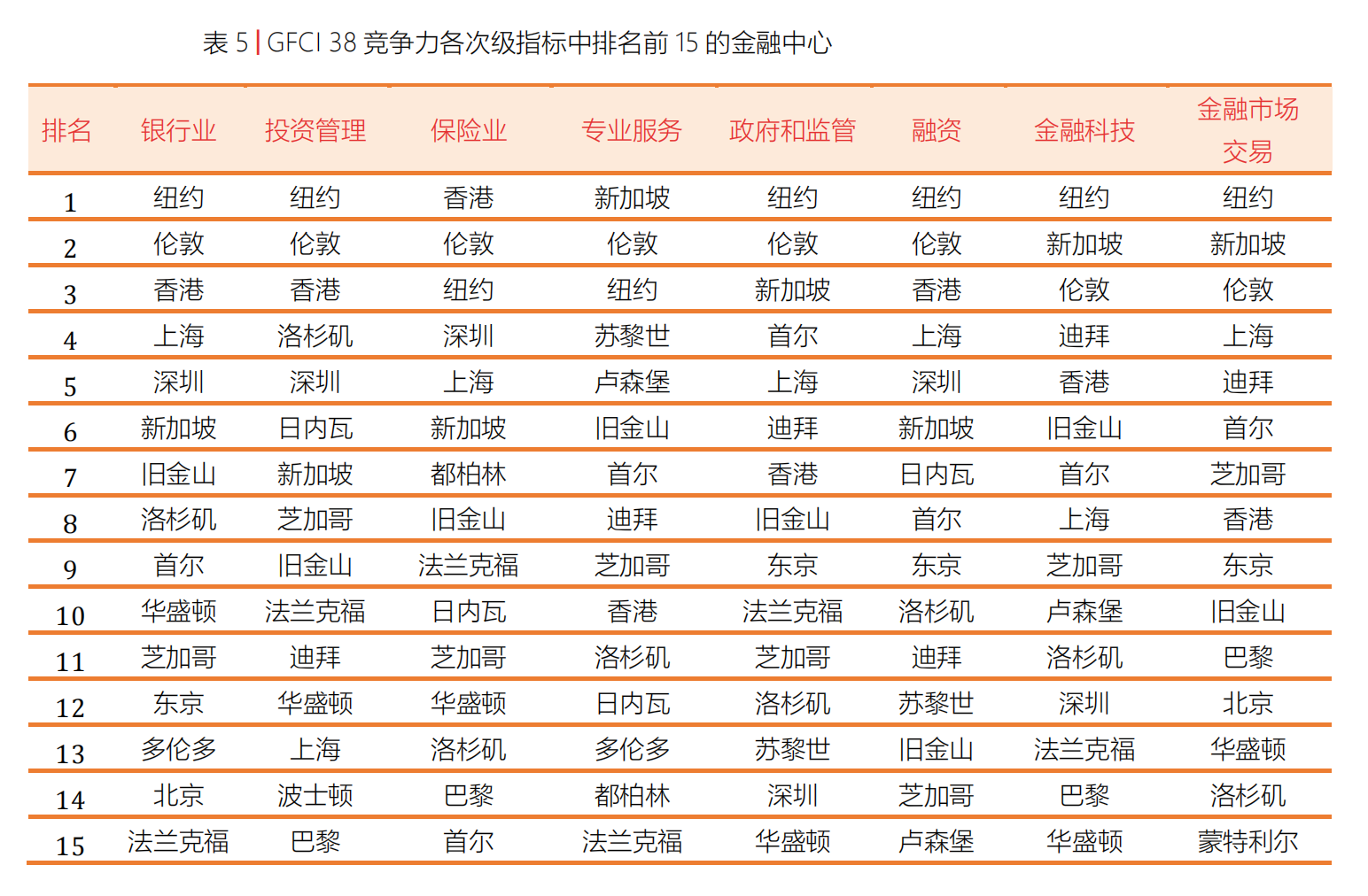 报告还搭建了竞争力次级指标的排名,涉及行业包括银行业、投资管理、保险业、专业服务、政府和监管、融资、金融科技和金融市场交易。上海在其中的5个指标(银行业、保险业、政府和监管、融资、金融市场交易)中排名全球前5,深圳在其中的4个指标(银行业、投资管理、保险业、融资)中排名全球前5。
