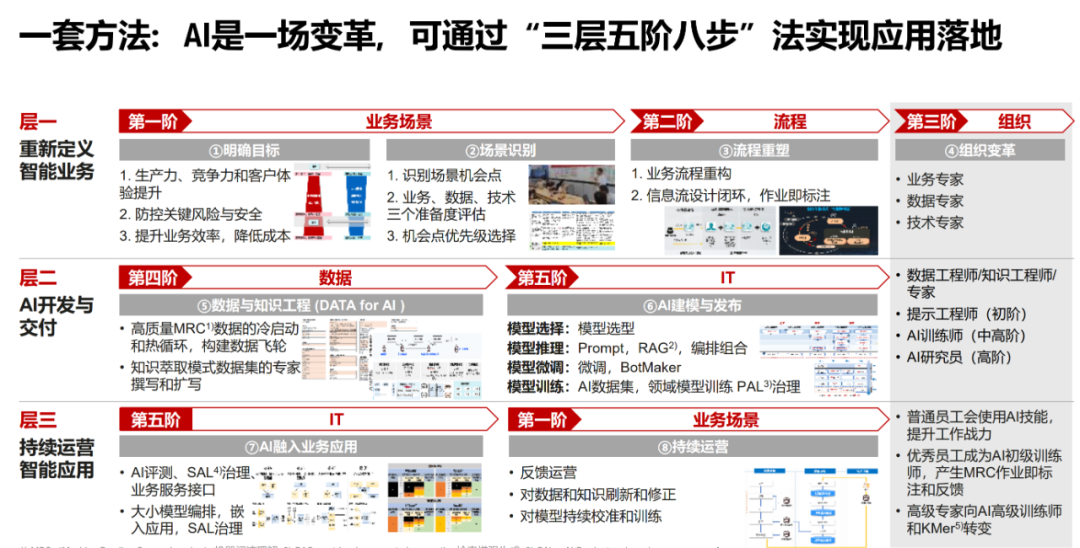 在华为与中国信通院、清华大学等单位还合作编写了《工业与AI融合应用指南》,深入分析了7个细分工业行业,诊断各个环节的痛点,提出“三层五步八法”方法论,为工业企业提供了清晰的AI落地路径。