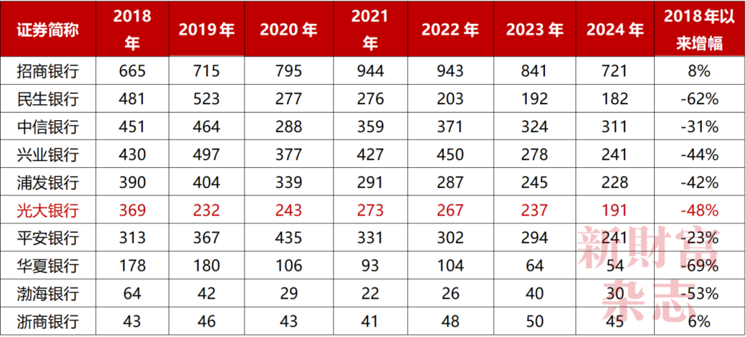 2018年,光大银行的手续费及佣金业务净收入曾创下369亿元的历史高点,此后波浪式下滑,至2024年已跌至191亿元,相比历史峰值跌幅达48%,几近腰斩(表5)。