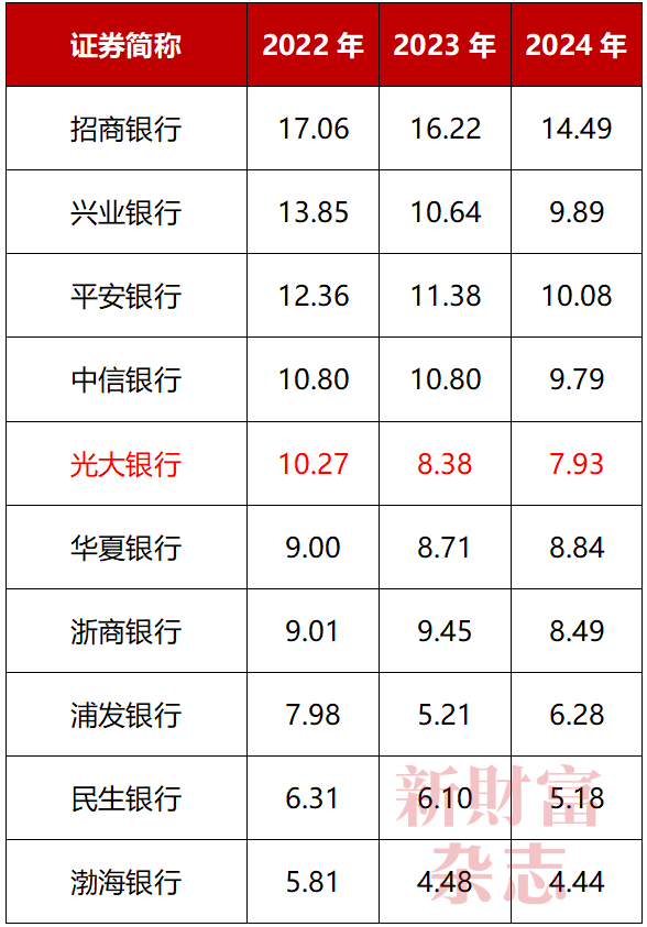 营收下滑不可避免带来光大银行盈利能力的下降。2022年,其净资产收益率(ROE,加权)为10.27%,在10家上市股份行中排名第5位。2024年,其ROE已跌至7.93%,排名下滑至第7,此前ROE低于光大银行的华夏银行、浙商银行实现反超(表8)。