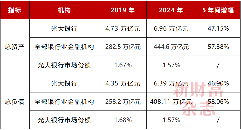 总资产及总负债的5年间增幅均跑输行业10多个百分点,这也使得光大银行在市场中的份额明显下滑。