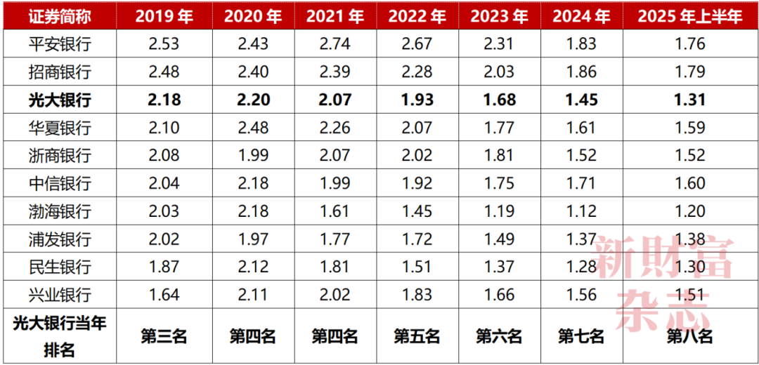 2019年,光大银行净利差尚能在10家上市股份行中排名第三,仅次于平安和招行,堪称行业领先;而到了2025年中报,其该项指标排名跌至第八,6年间,昔日净利差不及光大银行的中信银行、华夏银行、浙商银行、浦发银行、兴业银行均在这一核心指标上陆续实现反超,并保持至今(表4)。