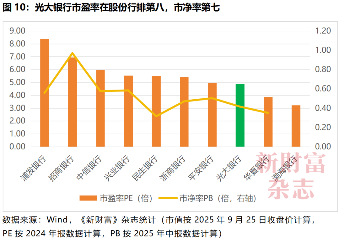 目前,光大银行最新市值约为2000亿元,市盈率为4.87倍,排在股份行中第八名,仅高过华夏银行、渤海银行;市净率为0.42倍,仅高过华夏银行与民生银行(图10)。