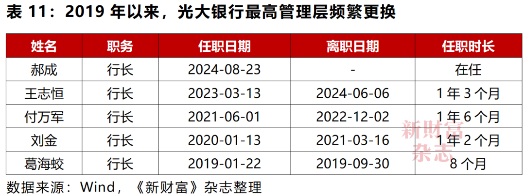 此外,2019年以来,光大银行已更换了5任行长,每任行长的平均任职时间不足14个月,这在国内股份行中也极为罕见(表11)。