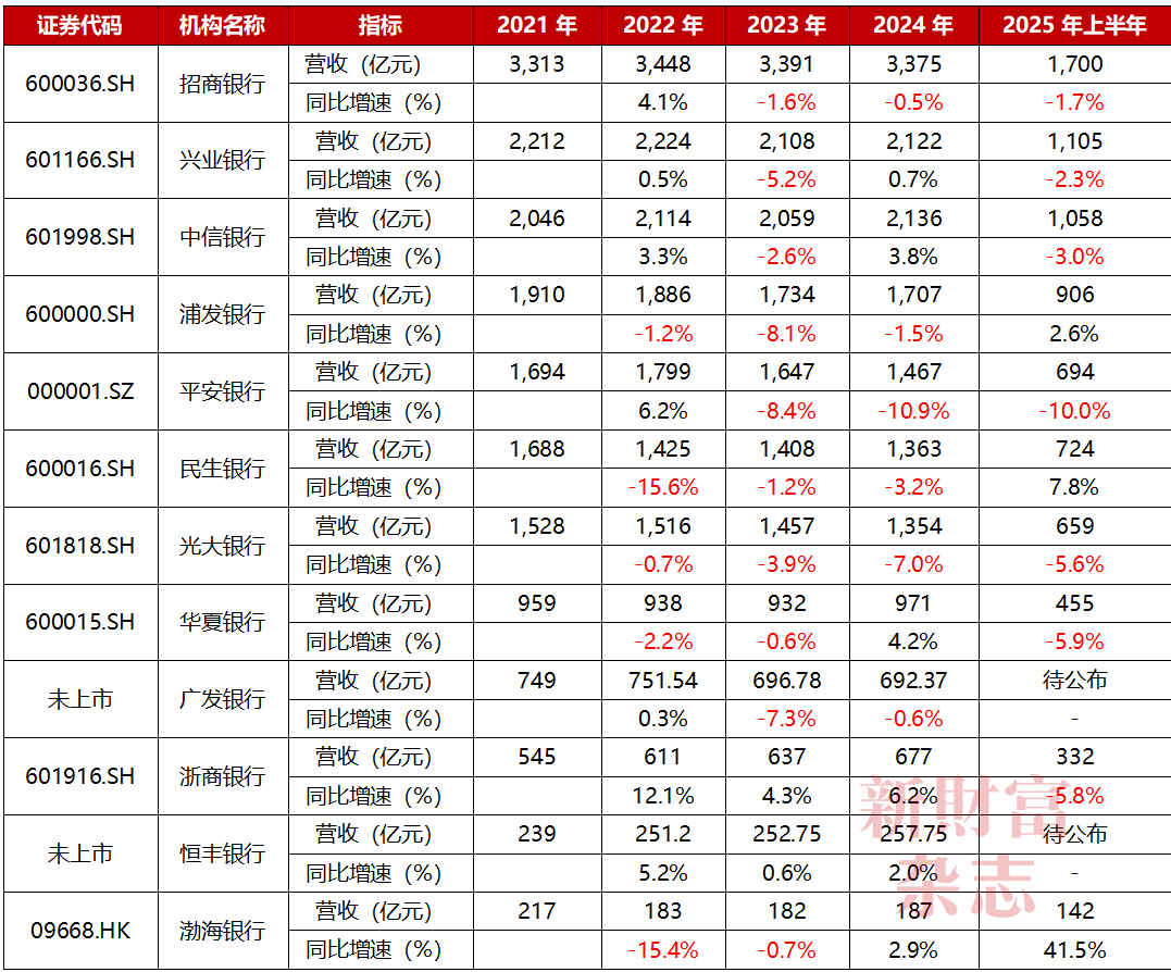 兴业银行、中信银行均只在2023年、2025年上半年出现营收下滑,2022、2024年均同比上升。而浙商银行更是在2022年至2024年间持续增长,2025年上半年才有所下滑。
